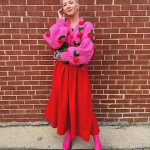 Cozy Handmade Strawberry Knit Cardigan, Chunky Oversized Sweater, 3D Embroidery, Gift for Her, Aesthetic Holiday Knitwear